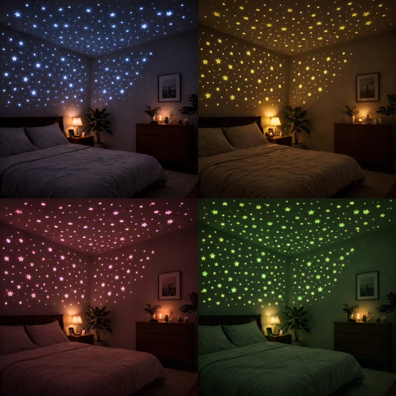 During the day, these colorful star stickers blend softly into your wall décor.At night, they glow beautifully — creating a calming, dreamy galaxy right above you.